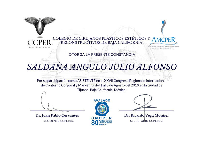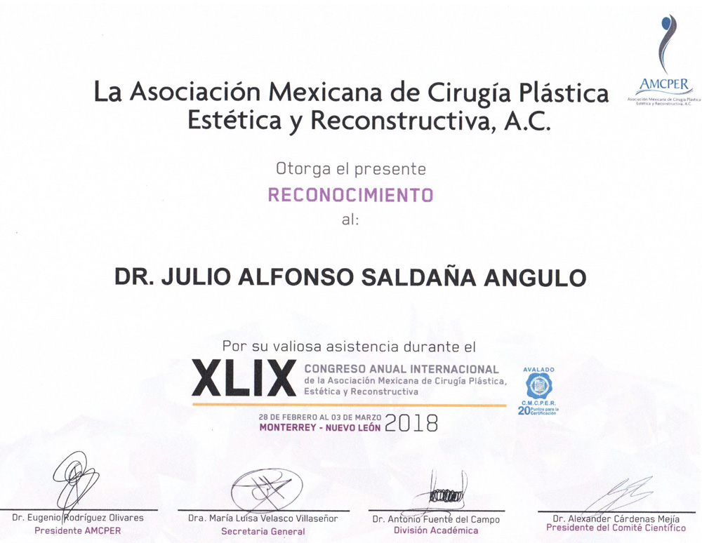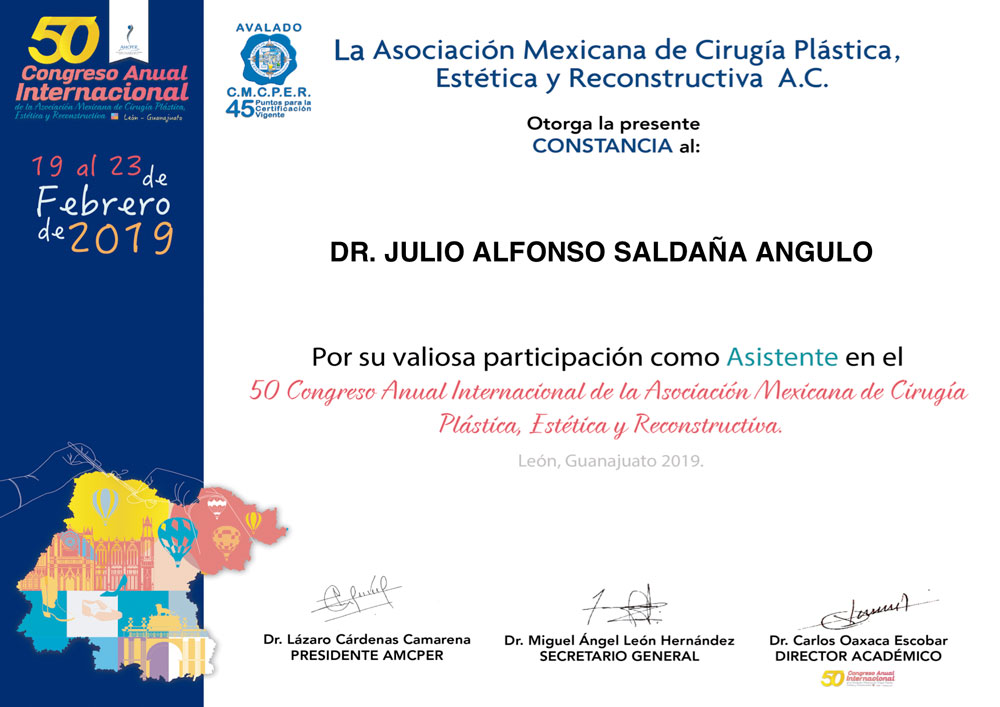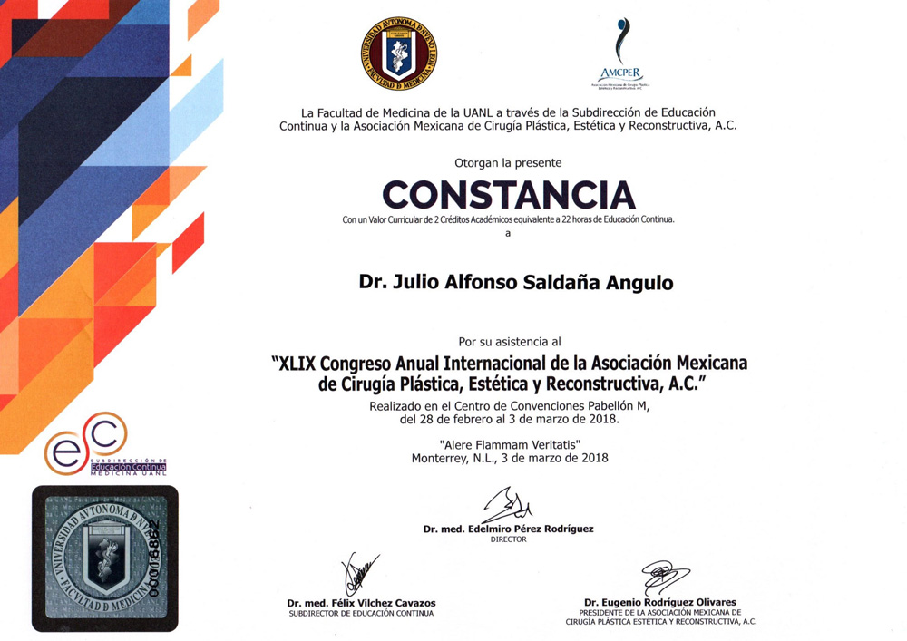 After achieving his degree as a general surgeon, Saldaña did a four year residency in Mexico City to obtain a board certification in plastic, aesthetic and reconstructive surgery. Dr. Saldaña's accomplishments include being a member of Mexico's Plastic, Cosmetic and Reconstructive Surgery Association and the San Diego Plastic Surgery Society, as well as the former president of the Plastic, Cosmetic and Reconstructive Surgery Association of Tijuana, and member of the Iberolatin-American Federation of Plastic Surgery.